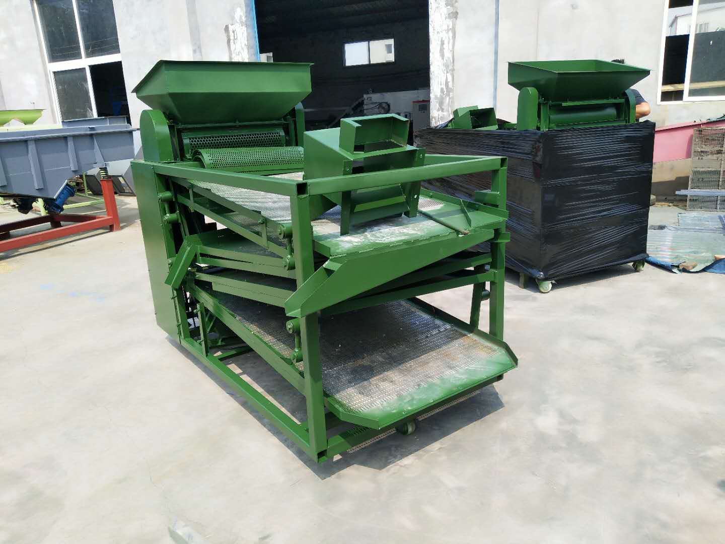 花椒除雜篩是利用打碎分離+篩選的方式進(jìn)行花椒打把脫粒篩選處理,原枝花椒放進(jìn)進(jìn)料斗后把花椒把打下來,花椒籽從殼里打出來,通過下料器落到篩面上篩選,一層篩選出來的梅花椒和大的花椒枝葉----二層是花椒籽,會(huì)落到風(fēng)機(jī)口進(jìn)行二次風(fēng)選----三層進(jìn)行復(fù)試篩選----四層是成品椒殼,可以直接打包,我們都知道花椒篩分機(jī)都是上下篩,下篩篩出來的花椒枝葉,以前十幾個(gè)人干的工作,現(xiàn)在只需一人就能完成,篩選凈度高,產(chǎn)量也大。